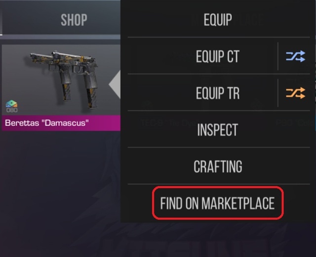 2) Нажимаем на выбранный скин, далее на кнопку «FIND ON MARKETPLACE»